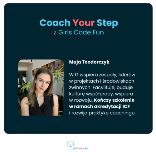 Maja Teodorczyk. For several years, she has been working in the IT industry, supporting teams and leaders in agile projects and environments. She focuses on facilitation, building a culture of collaboration, and supporting people in their development – and this naturally led her toward coaching.